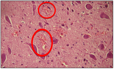 Figure 1 Microphotography of a sample, at the level of the obex in which the presence of focal hemorrhages (circles) is observed (H/E 400x). The structure of the nervous tissue is normal, with neuronal sums, and no vacuoles or spongiosis are observed.