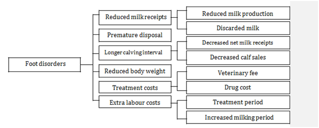 The economic losses due to lameness in dairy cattle industry are the result of clinical manifestation of the diseases and it leads to production losses rather than to the cost of treatment of the affected animals. In developed areas lameness can be blamed for the third largest economic loss after clinical/subclinical mastitis and reproductive disorders.1 In developing countries the major factors affecting the economy of the dairy industry are infectious diseases and malnutrition followed by lameness.44 The economic losses owing to diseases of the bovine digit can be divided into subgroups: direct and indirect costs.45,46