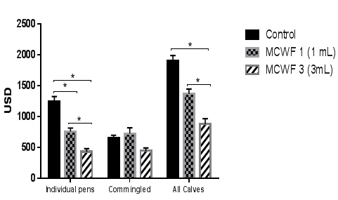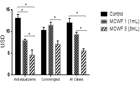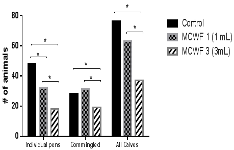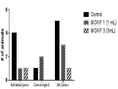 Data analysis from two commingled pens revealed that the animals receiving 3mL of MCWF demonstrated better health performance compared to both the MCWF 1 and control groups. This was significantly apparent in the number of sick animals (p<0.05) and average cost of treatments (Figure 1) (Figure 4). In addition, no mortality was observed in calves receiving 3mL of MCWF when commingled with other two groups (control and MCWF 1) (Figure 2). Surprisingly, the administration of 1mL of MCWF to 253lb. calves commingled with other calves showed no difference in terms of morbidity, mortality or total treatments compared to controls, and did not show any beneficial effect such as was observed in the MCWF 1 pen (Figure 1). The lack of efficacy for the administration of 1mL of MCWF in commingled pens could be attributed to lower antigen exposure and shorter immune stimulation which was not sufficient to provide prophylactic beneficial effect beyond the first 10days following MCWF administration. In addition, one may assume that the incubation period for BRDC causative agents were longer than the proposed time of immune stimulation with only 1mL of product, thus resulting in similar morbidity.