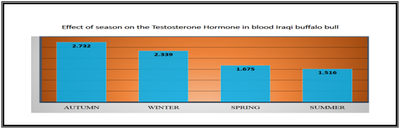 The results showed that the mean of the level of the hormone testosterone in blood serum in autumn (2.732±0.323) m.mol/L, winter (2.339±0.199) m.mol/L, sprig (1.675±0.249) m.mol/L and summer (1.516±0.122 ) m.mol/L The statistical analysis showed significant variation (p<0.05) between the level of the hormone through the different seasons of the year (autumn, summer) and that the highest level of the testosterone in the autumn, no significant variation between (winter, spring ) Table 1 & Figure 1.