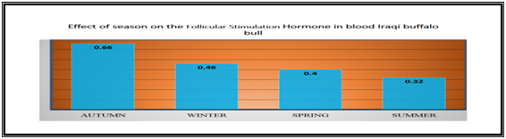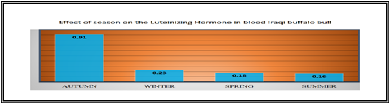 The mean level of LH hormone in blood serum in autumn was (0.91±0.26) m.u/ml, winter (0.23±0.06) m.u/ml, sprig (0.18±0.02) m.u/ml and summer (0.16±0.02) m.u/ml. The statistical analysis showed signification variation (p<0.05) between the level of the hormone in autumn and the other of season (winter, spring, summer).that the highest level of the LH in the autumn, there are no significant variation between winter, spring and summer. Table 1 & Figure 4.
