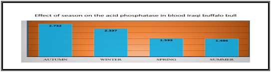 In Table 2 & Figure 6 showed the level of Acid Phosphatase in blood serum in autumn was (2.732±0.323) U/L, winter (2.337±0.195) U/L, sprig (1.533±0.185) U/L and summer (1.496±0.132) U/L. The statistical analysis showed significant variation (p<0.05) between the level of the Acid Phosphatase through different seasons of the year (autumn, spring, summer) and that the highest level of the Acid Phosphatase was in spring, autumn and followed by winter and the lowest level was in the summer.