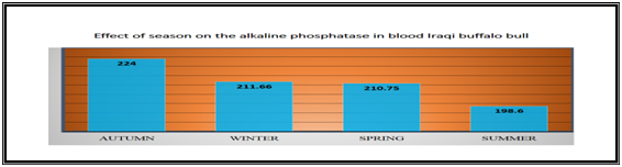 In Table 2 & Figure 7 showed the level of Alkaline Phosphatase in blood serum in autumn was (224±35.52) U/L, winter (211.66±36.95) U/L, sprig (210.75±16.69) U/L and summer (198.6±24.49) U/L. The statistical analysis showed no significant variation between the level of the Alkaline Phosphatase through the different seasons of the year and that the highest level of the Alkaline Phosphatase was in summer, spring and followed by winter and the lowest level was in the autumn.