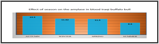 In Table 2 & Figure 8 showed the level of Amylase in blood serum in autumn was (13.5±1.95) U/L, winter (11.62±1.66) U/L, sprig (11.4±1.42) U/L and summer (8.6±3.2) U/L. The statistical analysis showed no significant variation between the level of the amylase through the different seasons of the year and that the highest level of the amylase was in autumn and the lowest in summer.