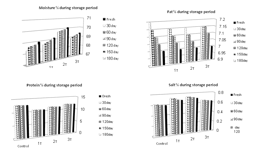 Content of all treatments fat % was slightly increased at the end of storage period comparing with fresh cheese as a result of moisture decreasing. Protein content slightly increased (all treatments) at the end of storage compared with fresh cheese as a result of moisture decreasing. These results agreed with those reported by Salem et al.,20 Kebray et al.21,22