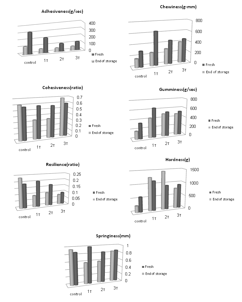 Treatment (T1) Chewiness values were higher than control, T2 and T3 in 30 days of storage and T3higher than control, T1 and T2 in end of storage. This data confirm the figures obtained from the measurement of adhesiveness. The linear increase of the synergist substitute and replacer used content had effect on decrease of chewiness. Zalazar et al. 33 reported that by decreasing the fat content, the protein matrix became more compact and the cheese texture was chewier. The use of fat replacers decreased the chewiness characteristics by loose the compact and dense protein matrix characteristics.29,34 Koca & Metin29 found out that the low-fat fresh Kashar cheeses produced by using fat replacers (SimplessesD- 100 and Raftiline®HP) were softer and less chewy. This result could be explained by activity of polar groups in fat mimetics resulting in increase in cheese moisture content and consequently improving the low-fat cheese texture. Konuklar et al.35 also reported that the low fat cheese samples exhibited more chewiness as the moisture contents decreased and vice versa.