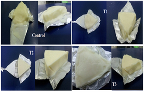 Data presented in Figure 4 for textural analysis and Figure 5 for textural appearance showed that trail T2 and T3 had the lower values of adhesiveness that the higher ratio of Gervisol in the cheese blend led to firmer product. Adhesiveness values of T2 were lower than control, T1 and T3 in the beginning and end of storage. The results of processed cheese adhesiveness which indicates lowering values (g/sec) comparing with control treatment in the beginning and end of storage period. It has been seemed that the synergist substitute and replacer used decreased adhesiveness. Many research results explained the factors affected adhesiveness in processed cheese; a higher fat content resulted in softer, less adhesive cheese analogues.27 Chen et al.2 who reported that increasing oil content augmented firmness and decreased adhesiveness and of processed cheese analogues. Similar result was observed by Bryant et al.,28 Koca & Metin,29 that decrease in fat content leads to a significant (p<0.05) decline of the adhesiveness of Cheddar and fresh Kashar cheeses. Increase in the xanthan gum concentration lowered the adhesiveness values of reduced fat Cheddar cheeses.30,31 In contrast, there was an increase in the adhesiveness of processed cheeses when cheddar was replaced by casein.32