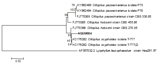 WRF are ubiquitous in nature and grow as saprophytes on dead and decaying trees usually in the forest ecosystem and are exceptional with the ability to selectively degrade lignin with the help of some extracellular enzymes like Laccase, MnP, LiP and VPalong with oxidases which generate extracellular H2O2. Basidiocarp of AGUM004 was collected from the forest where the substrate was represented by decaying wood which was the initial indication of presence of one or more LMEs. Further microscopic observation of spores, hyphae and septa was considered to determine it as basidiomycetes. As confirmatory test, molecular identification techniques involving DNA sequences which are more precise and efficient was considered to check whether collected wild isolate was member of basidiomycetes. Accordingly, more frequently employed method of using Internal Transcribed Sequence (ITS) region of ribosomal DNA through the use of ITS 1 and ITS 4 primers to identify unknown fungal isolate was adopted. The isolate was identified through comparison with BLAST of the known fungal sequences in a distinct study carried out in our laboratory. The phylogenetic analysis confirms the novel isolate belongs to Clitopilus genus which is a member of basidiomycetes.