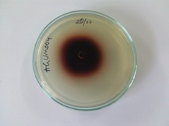 Initial screening for lignolytic enzymes production was carried out on 0.02% Guaiacol supplemented LME basal agar medium which contains 0.1% KH2PO4, 0.05% C4H12N2O6, 0.05% MgSO4.7H2O, and 0.001% of CaCl2 and 0.01% Yeast extract, 0.0001% of CuSO4.5H2O, and Fe2(SO4)3,0.5% of Tween 80 and 0.002% MnSO4.H2O with 2% of Agar. Plates were inoculated with culture by means of standard agar plug technique in triplicates.29 The inoculated plates were incubated for 10 days and were checked for oxidation of guaiacol. Production of lignolytic enzymes were confirmed by the formation of halo reddish brown ring due to the oxidation of guaiacol. The culture was then screened for Manganese peroxidase production along with other lignolytic enzymes using LME basal liquid medium without agar. 50ml of LME basal medium in 250ml shaken flasks was inoculated with two40mm culture plugs from well grown culture on PDA plate for incubated 7 days at 30°C. Supernatant from the culture broth was used to check the production of MnP and other lignolytic enzymes such as Laccase, Lignin Peroxidase and versatile peroxidase.