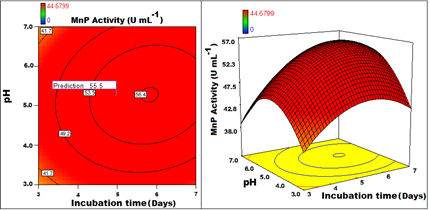 Figure 4 Contour and 3D response surface graph plotted for MnP activity with Incubation time Vs pH.