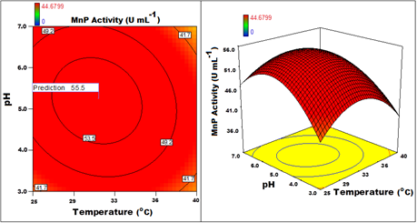 Figure 5 Contour and 3D response surface graph plotted for MnP activity with Temperature VspH.