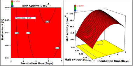 Figure 6 Contour and 3D response surface graph plotted for MnP activity with Incubation time VsMalt extract.