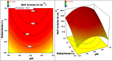 Figure 7 Contour and 3D response surface graph plotted for MnP activity with Galactose Vs pH.