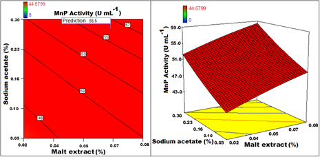 Figure 8 Contour and 3D response surface graph plotted for MnP activity with Malt extract Vs Sodium acetate.