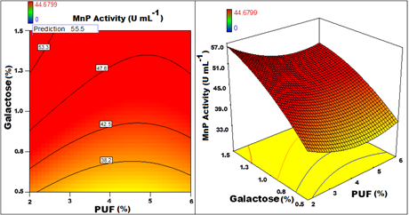 Figure 9 Contour and 3D response surface graph plotted for MnP activity with Galactose Vs PUF.