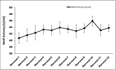 Figure 13 Continues MnP production through immobilized cells in optimized condition for 12 cycles.