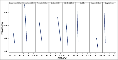Proximate analysis of all the straws treated with culture filtrate of C. scyphoides, revealed that there is a significant change in the percentage values of NDF, ADL, and ADF (at confidence interval 95%) when compared with control straws. All straws showed decrease in NDF, ADF and ADL. In-vitro digestibility of straws treated with MnP enzyme revealed that, in all the straws there is increase in % digestibility when compared with untreated control straws (Table 6) Finger millet and paddy straws were turned out be statistically promising results while straw and barnyard millet showed least response. Negative correlation was observed for correlation plots (Figure 15) plotted with ADL versus IVDMD with correlation coefficient of -0.83 for paddy, -0.92 little millet, -0.93 for foxtail millet, -0.81% barnyard millet, -0.97 for proso millet, -0.75 for brown top millet, -0.92 for finger millet and -0.81for kodo millet.