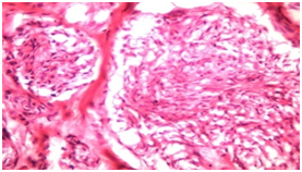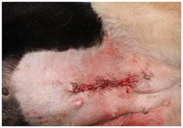 Surgery being the mainstay of the management for canine mammary tumours, simple or regional mastectomy (Figure 4), (Figure 5), (Figure 6) was performed in all cases in the present study and chemotherapy was not used because the results have, historically, been disappointing.26 Simon et al.27 reported that although dogs treated with chemotherapy had a tendency toward higher long-term local control and survival rate but there was no significant difference in the recurrence free interval, time to metastasis and overall survival with surgery alone or in combination with adjuvant chemotherapy. Gupta et al.21 also did not find significant difference in the mean survival time and survival rate between the dogs treated by surgery alone or surgery followed by chemotherapy. Low rate of death (reported in three animals) and recurrence (noticed in one case) during the study period might be due to the fact that the post operative period of follow up of only 3-12 months was less, as Bostock28-32 reported that animals with benign tumours had mean survival time of at least 114 weeks and those with malignant tumours survived for 70 weeks. Currently there is no surety way to prevent mammary tumours in dogs but several things may help to reduce that risk. Among them, spaying a bitch before her first heat cycle is strongly protective against breast cancers in canines. Some authorities recommend not to bred females with history of mammary tumours as it may have hereditary association.