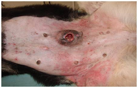 Figure 4 Mammary adenocarcinoma: The ulcerated tumour of left caudal abdominal gland is firmly adherent to the skin and underlying tissues.
