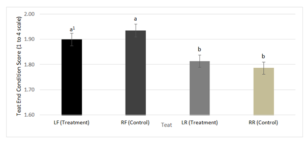 Scores remained at a 1 for teat skin color and teat skin chapping for the duration of the study, therefore no further analyses were performed. The teat scored, the week of the study, and the interaction of teat and week of the study were all significant predictors of teat dryness and teat end condition (P≤0.001). Individual examination of teat end condition on each teat showed no significant differences between treatment and control as shown in Figure 1. However, when comparing the front teats with the rear teats on either the treatment or the control side of the udder there were significant differences between scores. On the treatment side, the front teat was scored greater than the rear teat (mean±SD; 1.89±0.03 vs. 1.81±0.02). Similar results occurred on the control side of the udder, with the front teat scoring higher than the rear teat (1.93±0.03 vs. 1.79±0.02). This difference could be attributed to a tendency of front teats to give less milk than rear teats.16 As a result, the front teats are at greater risk of being over milked in comparison to the rear teats, causing an increase in teat end scores.17 Teat dryness scores in the front teats of the treatment side were significantly greater than control teats (1.10±0.01 vs. 1.06±.01; P≤0.001). No significant differences were found between treatment and control scores in the rear teats for teat drynessas shown in Figure 2. Overall, the difference in teat end condition and teat skin dryness scores discussed are minimal enough that they may not suggest a biological difference.