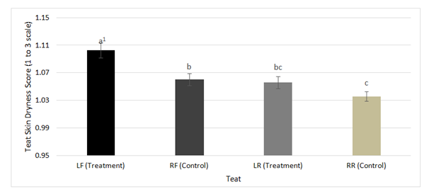 Teat scoring was completed once per week during the afternoon milking after the milking clusters were detached prior to application of the treatment according to National Mastitis Council approved methods.13 Teat end condition was scored on a 1 to 4 scale, corresponding to the visibility of a hyperkeratosis ring. A score of 1 indicated no visible ring, 2 indicated moderate visibility, 3 indicated complete visibility, and 4 indicated extreme ring thickness).13 Teat condition was scored using three parameters. Teat skin color, teat skin dryness, and teat skin chapping were each scored on a 1 to 3 scale. Color was evaluated by examining any change in color tint or pigment. A score of 1 indicated a teat with normal pink coloring, 2 indicated a hint of blue or red coloring, and a score of 3 indicated complete reddening of teat skin.13 Dryness was evaluated using a friction test examining resistance upon touch determined by the scorer.12 A score of 1 indicated a smooth surface with no frictional resistance involved, 2 indicated slight frictional resistance and slight roughness, and a 3 indicated extreme roughness and a high frictional resistance level.13 Teat skin chapping was evaluated by observing cracks on the skin surface. A score of 1 indicated a smooth surface with no visible cracking, 2 indicated minor appearances of skin cracks, and 3 indicated extensive and irritated skin cracking.13 Following milking and teat condition scoring, the treatment, was applied to the left teats and the control was applied to the right.