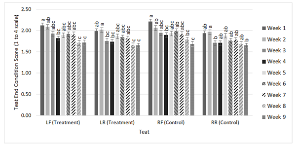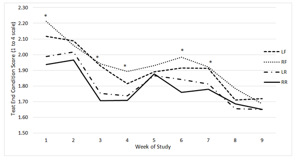 Figure 5 Weekly least square means of a mixed linear model generated by the MIXED procedure of SAS Version 9.3 for teat end condition scores. Scores for the LF, LR, LR, and RR are each distributed by all nine weeks.