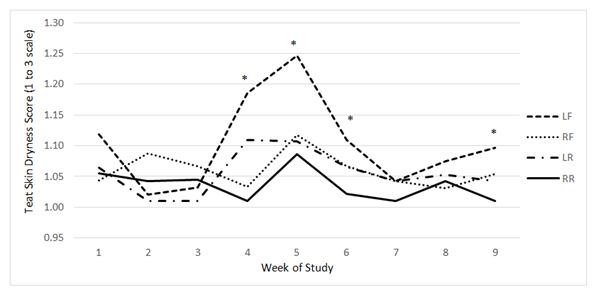 Figure 4 Least square means of a mixed linear model generated by the MIXED procedure of SAS Version 9.3 for teat skin dryness scores. Scores for the LF, RF, LR, and RR are distributed over time by the week of the study.