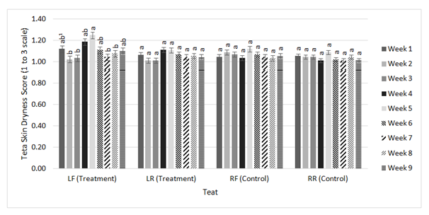 Figure 5 further illustrates a decrease in teat end condition scores in both the treatment side and control side. The LF, LR, and RF teats were scored significantly different and lower during week nine compared to week one, indicating teat condition improved over the course of the study. The RR teat remained around the same score throughout all 9weeks of the study. As previously discussed, the difference in teat end condition and teat skin dryness scores overtime may be due to factors other than through the use of the treatment. Figure 6 displays similar information for teat dryness scores. However, the statistically significant increases in scores during weeks four through six, previously attributed to teat exfoliation, do not have a significant difference in scoring for the LR, the RF, and the RR teats. For the LF teat, week 3 is significantly different and greater than week five, which was the period that included the occurrence of teat exfoliation which temporarily resulted in greater dryness scores. Therefore, based on the data provided, the change in teat end condition and dryness scores during the study were not enough to declare this post-dip to be unusable. Further studies should be conducted with the same treatment to determine any effects with long-term use as well as testing in accordance with somatic cell count to better quantify its practical use in mastitis prevention
