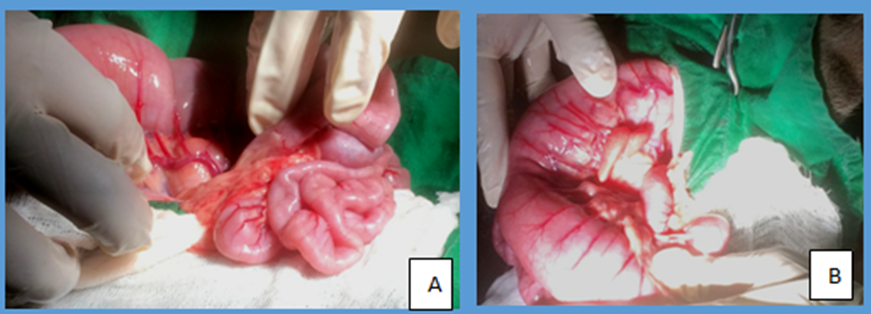 Figure 2 Abdominal surgery of C1, A - Arrow shows thickened bowel of > 5m, arrow head - enlarged LN. B- enlarged lymph nodes.