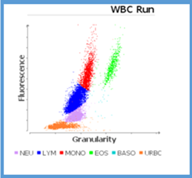 Figure 3 WBC dot plot of C2 - overlapped populations of Lymphocytes and monocytes due to lymphoblasts (arrow) and overlap of Neutrophils and lymphocytes due to severe secondary infections.