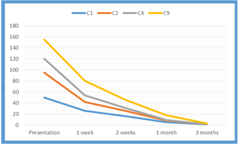Figure 4 Lymphoblastic count in the differential cell count of blood smear of C1, C2, C4 and C9.