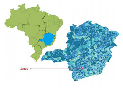 Lavras is a city in Southern Minas Gerais state, Brazil; located at an altitude of 919m (Figure 1). It has a population density of roughly 99,229 inhabitants and an area of the city is 564.7km² (IBGE 2014). The climate of the areas is of the Cwa type according to the Köppen classification, with an average annual temperature of 19°C and average annual rainfall of 1,530mm. In the soil sampling period, the temperature variation ranged from 10.0 to 33.8°C with an average temperature of 28°C and average precipitation of 14mm (Meteorological Station of the Federal University of Lavras - UFLA). The town native vegetation is represented by a mosaic of different phytophysiognomies of forest and Cerrado, which have been partially by substituted by pastures and agricultural crops, only small fragments of native vegetation remaining, usually quite anthropized.7