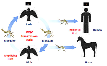 Since the West Nile virus (WNV) strain (B956) was isolated in 1937 from a clinical case was suffered from fever in the West Nile district of Uganda, WNV start to appear again in 1950s causing different infrequent outbreaks in different continent of the world including Egypt, Israel, France and India.1‒6 In the past 78years since its discovery, the disease has continued to increase in vast areas of the world to consider the main cause of viral encephalitis in the world. WNV is an emerging zoonotic arbovirus widely distributed throughout the world with both considerable impacts on public and animal health.7 The virus maintained in enzootic cycle involving mosquito’s vector and certain birds as reservoir hosts (Figure 1). There are many vertebrate hosts other than birds such as reptiles, amphibians, and mammals are susceptible to WNV infection.8 Although, humans and horses (incidental hosts) are not able to develop sufficient viremia to infect mosquito, and do not participate in the WNV lifecycle, it may undergo severe signs or death from infection. The virus was replicates in a wide range of mosquitoes and transmitted exclusively among avian species.2 Culex mosquitoes are infected during sucking viremic blood (approximately 104-105PFU/mL) Numerous reports have suggested that WNV may persist in the organs of birds in such a way as to permit retransmission to vector mosquitoes after the period of initial viremia.9