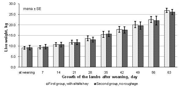 Intake of feed and dry matter in the lambs fed alfalfa hay was by 7% higher than those in the other group (Table 2). The lack of alfalfa hay in lambs from the second group was the reason for the higher intake of concentrate throughout the experimental period (Figure 1), which has led for the higher expense of concentrated feed and feed units for growth per kg gain (by 16.3%, Table 2).