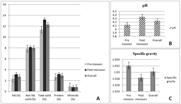 Results obtain from the present study have been reveal that the data (expressing as mean±standard error) from physico-chemical analysis of Black Bengal goats’ milk composition and statistical analyses (Table 2). It can be seen that milk fat, non-fat solids, protein and total solids percentages were the lowest during the pre-monsoon and the highest during the post-monsoon (Table 2).