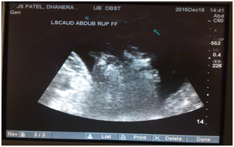 The eye mucus membrane was pale to pale-pink in four and congested in five calves. Similar observations were noted by Parrah et al.,2 and Tamilmahan et al.,6 in urinary retention cases. The mean heart rate, respiration rate and temperature were found within normal physiological limit at the time of presentation and on 12th day after surgery (Table 2). However Kushwaha et al.,3 and Tamilmahan et al.,6 observed tachycardia and tachypnoea with normal rectal temperature in buffalo calves with urolithiasis. Ultrasound is a non invasive diagnostic tool used for examination of urinary bladder, as small bladder cannot be detected by abdominal palpation or radiography.7 Trans-abdominal B-mode ultrasonograhic examinations with 3.5-5.0MHz transducer visualized the urinary bladder in all calves. In present study free fluid in abdomen and empty urinary bladder with floating abdominal organs (Figure 4), mainly intestine were observed in 6 calves with cystorrhexis, while in one calf subserosal urinary bladder rupture was observed, indicated by distended urinary bladder along with free fluid in abdomen. Similar findings were recorded in cases of urinary bladder rupture by Parrah et al.2 In two calves distended intact urinary bladder was imaged with dilated neck (Figure 5) having multiple hyper echoic foci without acoustic shadow which might be urinary sediments. Parrah et al.,2 have reported hyperechoic foci in distended urinary bladder of calves suffering with obstructive urolithiasis.