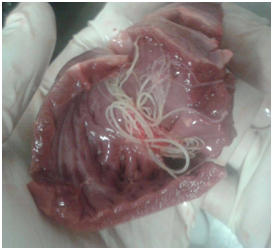 Cardiovascular injury caused by visceral leishmaniasis was investigated at the Center of Zoonosis Control, Fortaleza (CCZ). CCZ is a public health agency responsible for the euthanasia of animals suffering from according to Brazilian legislation. This study was approved by the Institutional Ethical Committee, State University, Ceara (Protocol number 2891954/2016). Dogs that tested positive for Leishmaniasis on both immunochromatographic rapid test (DPP® kit) and ELISA test (EIE-leishmaniose-canina-Bio-Manguinhos, EIE-LC kit), underwent blood collection for biochemistry test and ECG (ECGDeltaVet®) to evaluate possible heart damage before mandatory euthanasia. Unexpectedly, one of the studied animals displayed Dirofilaria immitis co-infection,1 which is not a common condition. This is a case study of a 5-years-old male Pit Bull dog that presented Leishmaniasis and Heartworm disease concomitantly.2 On physical examination, the dog presented weight loss, lesion on the tip of the ear and exfoliative dermatitis. Biochemistry tests and ECG showed the following results: creatine kinase (CK) 138.1 U /L; creatine kinase-MB (CK-MB) 66 U/L; aspartate transaminase (AST) 30U/dL; lactate dehydrogenase (LDH) 366U/L; P wave 52ms; QRS complex 76ms; PR interval 120ms; QT interval 200ms; ST segment 148ms; QT interval 519.875ms.3 Additionally, necropsy revealed large amount of long white/cream filarial worms in the heart identified as Dirofilaria immitis. Heartworms mainly occur in the right ventricle and pulmonary artery (Figure 1).