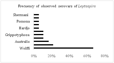 Drainage was present in 90% of the households. Regarding the number of people living in each household, the most frequent value was five residents per household (25.47%), followed by households with four inhabitants (23.58%) as well as other with less people. Rodents were reported in 75% of the households. A serological study of 106 samples from dogs living in the city of Culiacan, Sinaloa, indicated a prevalence of Leptospira Interrogans of 17%; the serovars detected were: wolffi, bratislava, australis, canicola, grippotyphosa, pyrogenes, hardjo, icterohaemorragiae, pomona, hebdomadis y shermani (Table 1). The observed frequency for serovars, from high to low was: Wolffi 66.6%, Bratislava 22.2%, Australis 16.6%, Canicola 11.1%, Grippotyphosa 11.1%, Pyrogenes 11.1%, Hardjo 5.5% Icterohaemorragiae 5.5%, Pomona 5.5%, Hebdomadis 5.5%, Shermani 5.5% (Figure 1).