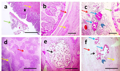 Figure 1 Microscopic pictures of H&E stained hepatic sections showing adult F. gigantica in lumen of large bile duct (green arrow) with thickened wall due to adenomatous hyperplasia of biliary epithelium (asterisk) and fibrosis (yellow arrow) (a), necrotic duct wall (green arrow) surrounded by fibrous tissue deposition (yellow arrow) (b), foci of basophilic calcification (blue arrow) appears in case of necrotic duct wall surrounded by mixed inflammatory cells (arrowheads) (c). Multifocal areas of coagulative necrosis (red arrow) and fibrosis (yellow arrow) (d). Lumen of bile duct expanded with laid eggs of F. gigantica (black arrow) (e). Wall of bile duct contained eggs of F. gigantica (black arrow) is necrotic (red arrow), inflamed (arrowhead), calcified (blue arrow) and surrounded by fibrous tissue (yellow arrow) (f). X:40 bar 200 (a,d,e,f) and X:100 bar 100 (b&c).