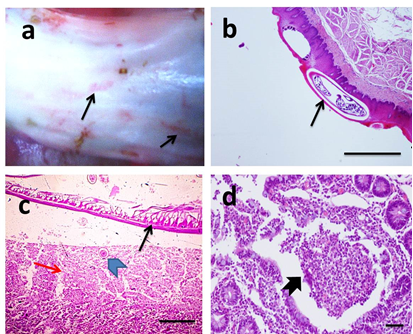 Showing presence of red spirurid gongolonema burrowed in esophageal mucosa (black arrow) (a). Microscopic pictures of H&E stained esophageal sections showing different stages of nematode worms surrounded by a clear space in upper epithelial lining (black arrow) without tissue reaction (b). Microscopic pictures of H&E stained intestinal sections showing adult female toxocara worm in lumen (thin black arrow) and its deposited egg (arrowhead) in enteric mucosa associated with coagulative necrosis of intestinal villi (red arrow) (c). Crypt abscess (thick black arrow) is observed in other intestinal sections accompanied ascariasis (d). X:40 bar 200 (b), X:100 bar 100 (c) and X:400 bar 50 (d).
