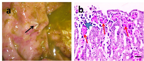Showing tapeworms attached to mucosa. Their segments are wider than they are long (black arrows) (a). Microscopic pictures of H&E stained intestinal sections showing mild mixed leukocytic cells infiltration (arrowhead) and dilated blood vessels in lamina propria (red arrows) (b). X:400 bar 50 (b).