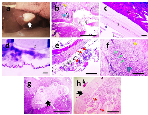 The anoplocephalid tapeworms (Moniezia spp.) were detected attached to intestinal mucosa. The site of attachment on the intestinal mucosa may be indicated by the presence of a small ulcer and a mild inflammatory response (Figure 3a). Histopathological examination of intestinal mucosa revealed focal ulceration, mild leukocytic cells infiltration in lamina propria and submucosa associated with dilated blood vessels (Figure 3b). Severity of lesion due to tapeworms was graded I.Gross appearance of hydatid cysts revealed single to multiple cysts of varying size were observed from the visceral and/or parietal surfaces of liver (Figure 4a). In general the cysts were soft and doughy to touch and were filled with clear to slightly turbid fluid.The incised cysts contained a turbid, amber liquid with hydatid sand. However, some cysts were appearing firm and contained inspissated contents. Also, some cysts were calcified, gritty and hard to cut. Microscopically, hydatid cysts may be living (sterile&fertile) and dead. Histopathological examination of sterile cysts displayed three-layered wall architecture, with an outer, host-derived adventitial layer, an acellular intermediate laminated layer, and an inner germinal membrane of parasitic origin (Figure 4b–4d). The outer adventitial layer consisted of a chronically inflamed fibrous tissue with scattered foci of calcification. In fertile hydatid cyst, daughter cyst showing broad capsule containing many scolices was seen in some cases (Figure 1e). Lesions detected in adjacent hepatic tissue were hydropic degeneration, focal steatosis, necrosis, aggregations of macrophages and Langhan's giant cells (Figure 1f), expanded portal areas with fibrosis (Figure 1g), dilated blood vessels and inflammation,. Meanwhile, histopathological examination of dead cysts displayed necrotic hyalinized germinal membrane surrounded by thick fibrous wall. In those cases, lesions detected in adjacent hepatic tissue were telangiectasia, mild degeneration and few leukocytic cells infiltration (Figure 4h). Severity of lesions due to hydatid disease was graded from I (mild) in case of dead cysts to III (severe) in case of living cysts.