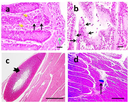 Showing eimeria gamonts in crypt epithelium (black arrows) with mixed leukocytic infiltertion in lamina propria (yellow arrow) extending to muscular coat (green arrow) (a). Moderate villous atrophy associated with presence of small many basophilic rounded bodies attached to epithelium (black arrows) (b). Microscopic pictures of H&E stained esophageal sections showing major (thick black arrow) (c) and minro (thin black arrow) (d) sarcocyst in muscle fibers. X:400 bar 50 (a&b), X:40 bar 200 (c), X:100 bar 100 (d).