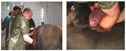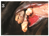A pluriparus full term dairy cow in its 4th parity brought to clinical veterinary hospital, Faculty of veterinary Medicine, Assiut University, Egypt, with history of straining since last 6hours with no progression in parturition as well as it fails to make any progress towards delivery (Figure 1 & Figure 2). Per vaginal examination revealed fully dilated cervix as well as it may detect a disoriented fetus and palpated only a three fetal’s legs (Figure 3). To manage this dystocia, caesarean section was performed. Under local and high caudal epidural anaesthesia, caesarean-section was performed on the left flank region, adopting the standard operating procedure and the cow was positioned at standing condition (Figure 4 & Figure 5). The Schistosoma reflex us fetus was extracted out (Figure 6 & Figure 7).