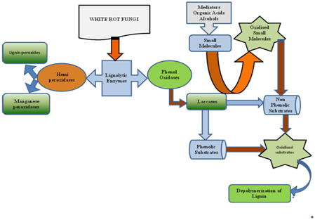 Lignolytic enzymes: The white-rot basidiomycetes are strong decomposers of lignocellulosic biomass on account of their capability to synthesize the relevant and unique oxidative network of lignolytic extracellular enzymes.18,19 Mineralization of lignin is achieved primarily by peroxidase and phenoloxidase enzymes known as lignin-modifying enzymes (LME's). They produce highly reactive radicals which oxidize both the phenolic and non-phenolic lignin components which are of great significance to the agricultural community (Figure 1). Laccases (benzenediol: oxygen oxidoreductase EC 1.10.3.2) belong to multicopper oxidase family and these copper-containing enzymes catalyze the oxidation of various substrates with the simultaneous reduction of molecular oxygen to water. The catalytic site of laccase is quite conserved among different species of fungi, but the rest of the enzyme structure shows high diversity. Fungal laccases are mostly inducible, extracellular, monomeric glycoproteins with carbohydrate contents of 10-20% which may contribute to the high stability of laccases. Laccases are usually the first ligninolytic enzymes secreted to the surrounding media by the fungus that normally oxidizes only those lignin model compounds with a free phenolic group, forming phenoxy radicals as the mediators that are a group of low molecular-weight organic compounds all fungi that have been examined so far produce more than one isoform of laccase.Lignin peroxidases (EC 1.11.1.14) belong to the family of oxidoreductases were first described in the basidiomycete Phanerochaete chrysosporium(Burdsall) and the enzyme has been recorded for several species of white-rot basidiomycetes. Lignin peroxidases (LiP) is an extracellular hemeprotein, dependent of H2O2, with an unusually high redox potential and low optimum pH and is capable of oxidizing a variety of reducing substrates including polymeric substrates. It has the distinction of being able to oxidize methoxylated aromatic rings without a free phenolic group, generating cation radicals that can react further by a variety of pathways, including ring opening, demethylation, and phenol dimerization and in contrast with laccases does not require mediators to degrade high redox-potential compounds but it needs hydrogen peroxide to initiate the catalysis.