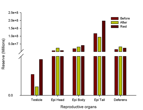 Spermatic reserves: There was a difference (P<0.05) in reproductive organs' spermatic reserves (Figure 3). There was no difference (P>0.05) in spermatic reserves by the time of the sexual period.