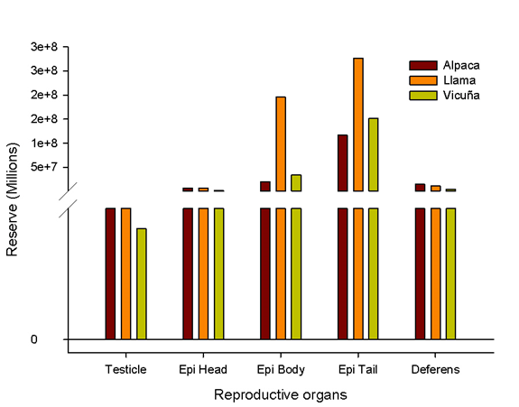 Figure 4 Spermatic concentrations (millions of spermatozoa) in different reproductive organs of male llamas, alpacas, and vicunas.