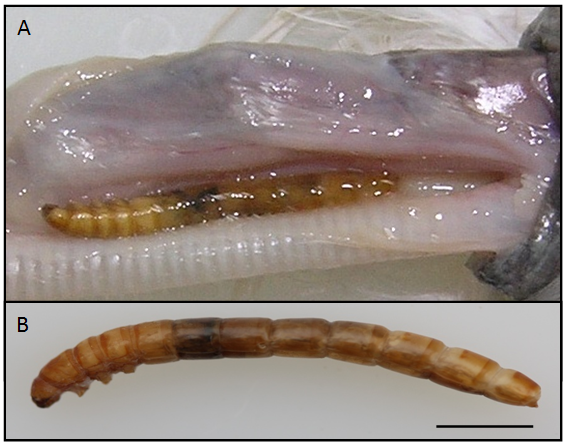 Beetle larvae have been recovered from human organs; tonsils,10 nose and urinary bladder,15 umbilical cord,16 and the gastro-intestine tract.3,10,17 However, the alimentary canal is the most common habitat for parasitizing beetle larvae.10 Therefore, the gastrointestinal canthariasis is usually found in humans.3 On the other hand, the cases of extra alimentary canal canthariasis are especially rare in animals same as our case. In cases of gastro-intestinal canthariasis by beetle larvae, mealworms are the ones most often implicated. Most of the time, eggs or larvae are ingested in cereals and various breakfast foods, and in either case, live larvae can eventually be passed and excreted through the feces.3 In our case, a larva of insect was detected in the space between the esophagus and trachea under the skin of neck of a wild bird, E. Intermedia. In our study, the worm was identified to be a T. Molitor L. This report is a rare case of subcutaneous canthariasis due to a yellow mealworm, T. Molitor L, in a wild bird.