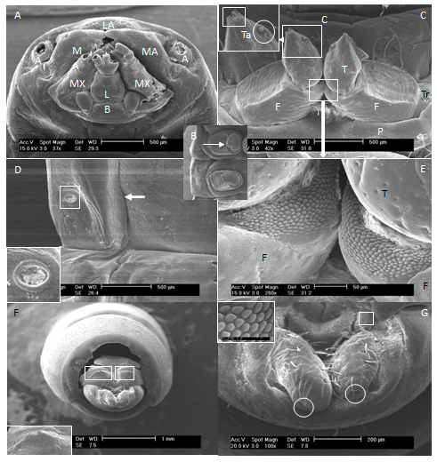 For scanning electron microscopy, the larva washed five times with 0.2 M cacodylate buffer (pH 7.3), fixed in 2.5% glutaraldehyde and post fixed in 1% osmium tetroxide at 4°C. The specimen was dehydrated in a graded ethyl alcohol series, dried by CO2 critical point, coated with gold and examined by SEM (S-4800, Hitachi) at 15 kV.
