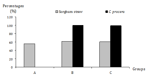 Table 2 presents the cconsumption level of distributed fodder. Average ingestion rates of C. Procera were 100% and 98.68% in groups B and C respectively. The dry matter quantities of C. Procera leaves ingested in group C represent approximately the double of the quantities ingested in group B. In the three experimental groups, the animals did not consume all the sorghum straw and the ingestion rates varied significantly (P<0.05). The consumption of sorghum straw in the supplemented groups was higher than that in the control group, where the mean ingestion rate was 55.44%. In the groups supplemented, no significant differences (P˃0.05) were noted between group B (61.39%) and group C (60.58%). In addition, Figure 1 indicates that consumption of 100 g dry leaves of C. Procera (per animal per day) induces a high intake of sorghum straw in the supplemented groups.